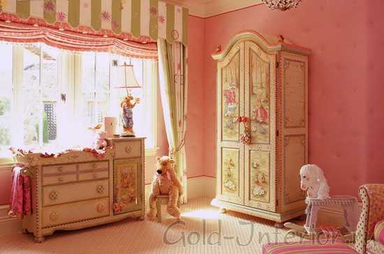 Очень распространенный сегодня стиль оформления детской – классика. Если вся ваша квартира соответствует этим канонам, можно логично продолжить его и в комнате малыша. Тем более, если вы хотите в будущем приобщать ребенка к искусству и литературе, будете воспитывать в аристократической манере, как настоящую леди. Здесь подойдет детская мебель для девочки из натурального дерева с резными ножками, лучше в коричневых тонах. У изголовья кровати можно повесить атласную штору с ламбрекеном или даже сделать романтичный балдахин. В качестве аксессуаров используйте: