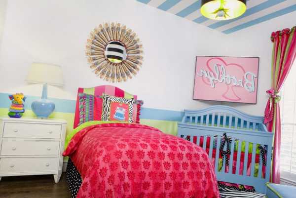 - Следующий пример более яркий, призывающий вас не бояться использовать рядом яркие контрастные цвета – в детских комнатах это только поощряется. А в комнате для двух девочек разные цвета можно использовать на разных половинах помещения.