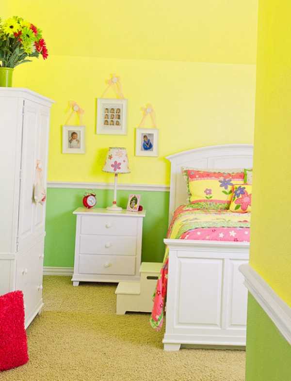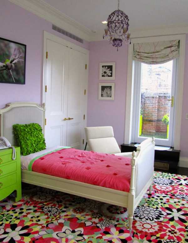 - Лучший фон для сиреневого цвета, в данном случае, белый. Стены комнаты для девочек можно украшать многочисленным розовым и салатовым декором, как на фото, а вот желтый цвет лучше отставить в сторону.