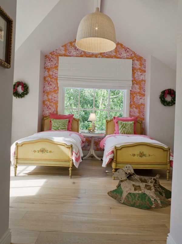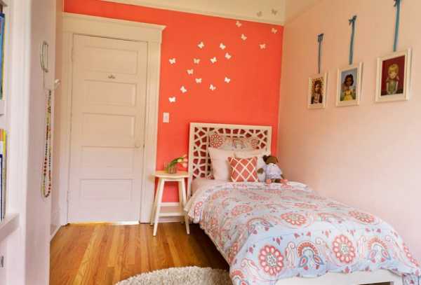 - Небольшие вкрапления апельсинового разбавят розовый интерьер и заставят его выглядеть теплее. Кстати, обратите внимание на повсеместность применения розового – им оформлены даже плинтуса и оконные рамы. Не обошлось и без нанесения рисунков на мебель – если не хотите прибегать к росписи, можете купить готовые наклейки с бабочками или цветами.