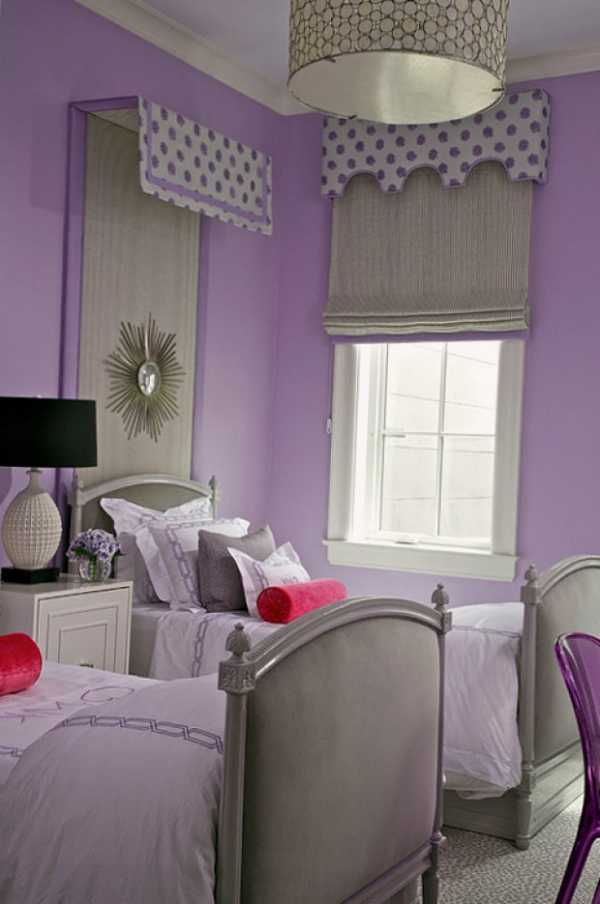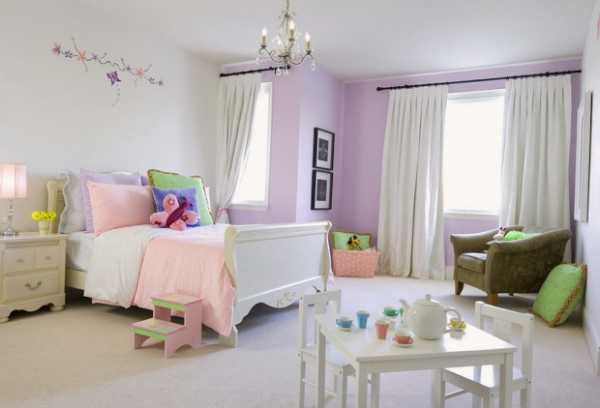 - Спокойный бледно-сиреневый цвет по праву занимает второе место после розового, являясь часто употребительным в оформлении комнат для девочек. Его можно использовать по аналогии с розовым, добавляя повсеместно – корпусная мебель, кровать, коврик, шторы очень красиво смотрятся в тональных переходах.