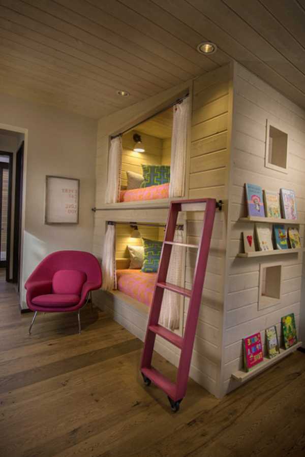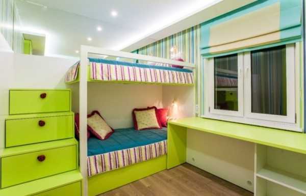 7) Эта комната имеет пеналообразную форму, но ее владельцы отлично справились с дизайном. Вытянутый стол — прекрасное пространство для выполнения уроков, двухъярусная кровать дает возможность поселить в комнате двух девочек. А яркие ящики выполняют сразу две функции – хранения вещей и ступенек для подъема на второй этаж кровати. Недорогую корпусную мебель украшают сочные оттенки, напоминающие о морской тематике.