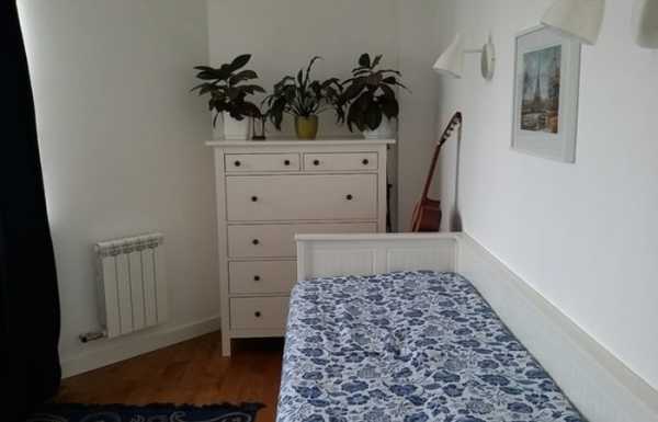 6) Эта мини-комната наполнена белым цветом, дающим отсылки к стилю модерн. Стены помещения декорированы обоями под краску, комната выходит на южную сторону, поэтому окна для защиты от солнца декорированы тяжелыми бархатными занавесками. Для пола использовался паркет, приносящий в помещение уют, кровать покрыта покрывалом с ярким принтом. Маленький радиатор и компактный комод для хранения вещей завершают ансамбль.