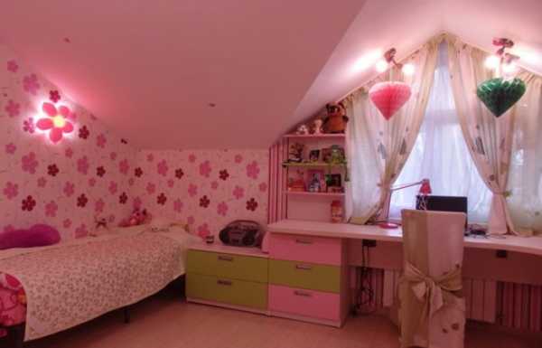 8) Комната в мансарде, поэтому потолок скатный, а источников света очень много: навесные светильники, центральная лампа, ночники. В помещении преобладает розовый оттенок, дополненный тематическими аксессуарами и такого же цвета мебелью. Пространство распределено на полезные зоны: кровать, полки для игрушек, стол для работы, просмотра мультфильмов.