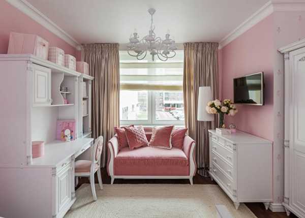 Комната юной принцессы оформлена в классических девчачьих цветах. Акценты ярко-розового делают интерьер ярким и красочным.