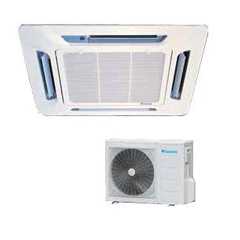 Устанавливается под подвесным потолком. Распределение воздуха идет не по воздуховодам, а рассеивается сразу из блока в четырех направлениях. Такие кондиционеры прекрасно охлаждают большие комнаты. Наличие блока незаметно, т. к. место его расположения в потолке перекрывается решеткой.