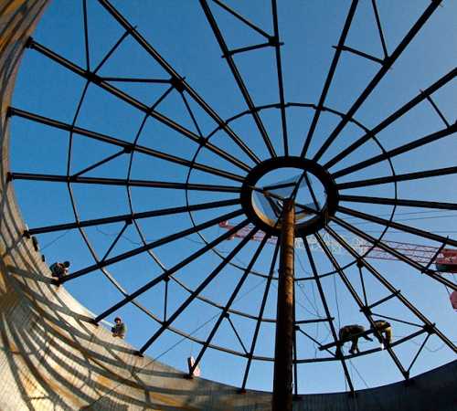 Есть иной способ устройства купола, который предложил архитектор из Америки Р.Б. Фулер. Он представил создание купола в виде конструкции, которая образуется треугольниками. «Геодезический купол» — такое название имеет этот проект. Несмотря на то что он был представлен еще в 1951 году, распространенным он не стал. Скорее всего, из-за того, что данная конструкция купола имеет достаточно сложный расчет и необычный внешний вид.