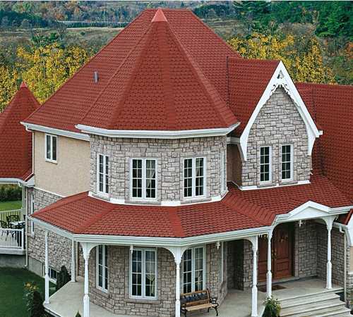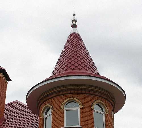 Здесь нужно принять во внимание, что начиная укладывать черепицу снизу вверх, каждый последующий ряд будет меньшей ширины, чем предыдущий, причем черепица должна иметь скос или искривление, которое будет соответствовать коническому изгибу крыши. Сегодня этот вопрос решается более просто, большинство производителей черепицы выпускают несколько моделей, которые рассчитаны именно для укладки на конические крыши, поэтому стоит выбирать именно такую черепицу. Вам остается правильно рассчитать общую площадь кровли, установить точный угол наклона, длину стропил и это позволит приобрести сделать правильный выбор материала.