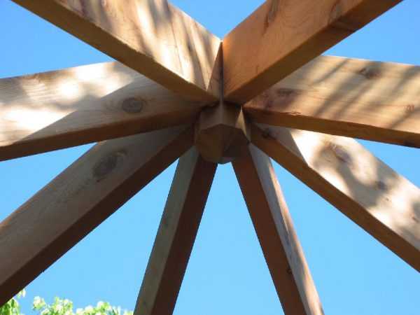 5. Стропильная конструкция изнутри: стропила равномерно должны быть уложены на деревянный полукруг, закрепленный на вершине опорного столба