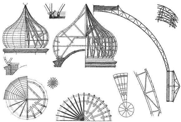 Если купол имеет диаметр не более 3 м, то для него можно делать деревянный каркас. Стропильные ноги луковичного купола имеют специфическую форму, которая называется «журавец». Как правило, в луковичном куполе применяется наслонная стропильная система. Дополнительную жесткость стропильным ногам придают подкосы и раскосы, которые устанавливаются в точках наибольших нагрузок, дабы предотвратить разрушение купольной конструкции.