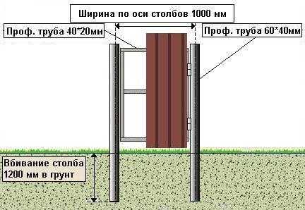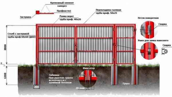 Створки, как уже отмечалось, крепятся к стойкам. Функцию опорных столбов могут выполнять трубы из стали. В большинстве случаев достаточно изделий диаметром около 6 см. Нужную длину опоры подбирайте в соответствии с запланированной высотой будущих самодельных ворот. К рассчитанной длине добавьте еще примерно 30-35% — именно такая часть трубы должна быть вкопана в землю.