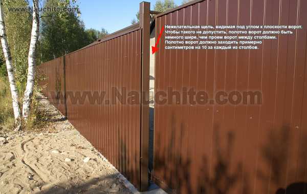 Обращаем Ваше внимание на то, что всё, написанное выше, касалось ширины проема ворот, но не ширины полотна ворот! Если говорить о полотне ворот, то тут есть один важный момент, который нужно учитывать. Ширина полотна ворот должна быть примерно сантиметров на 20 больше, чем ширина проема ворот! В противном случае при закрытых воротах у Вас будет щель, заметная под углом к плоскости ворот (см. фото ниже). Если Вы забыли попросить изготовить полотно ворот чуть шире запланированной ширины проема, — Вы можете исправить ситуацию, установив воротные столбы чуть ближе друг к другу, чем планировали. Таким образом Вы уменьшите ширину проема примерно сантиметров на 15-20, но зато избежите образование щели.