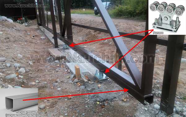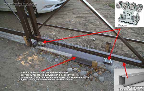 К швеллеру привариваются роликовые тележки. По ним и будет передвигаться направляющая. Если готовое устройство открывается с трудом, его можно отрегулировать.