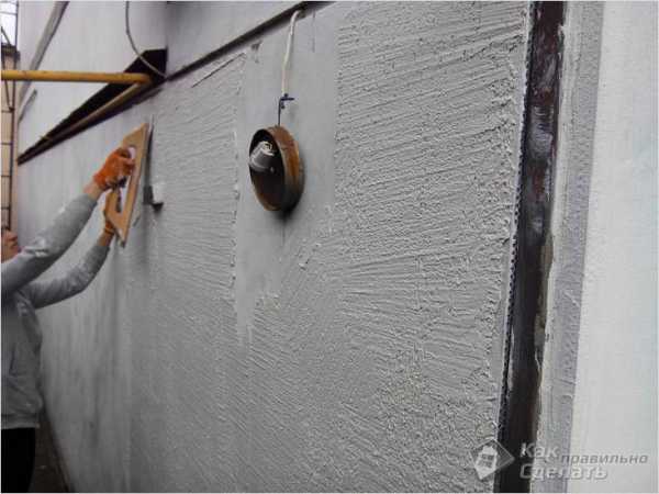 - Нанести штукатурку на поверхность стены шпателем и разровнять металлической теркой.