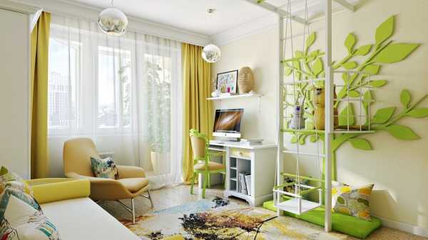 Вся мебель должна быть многофункциональной. Не обязательно все устанавливать вдоль стен, строго в одну линию. Выделенные островки и подиумы здесь только приветствуются. Для малыша кровать-чердак будет идеальным вариантом. В свободной нижней части можно установить выкатной стол, небольшой встроенный шкаф. Полноценную кровать для взрослых поставить не удастся, только диван. Но, если хорошо поискать, то можно купить модель с ортопедическим матрасом.