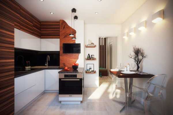 Кухонное помещение в хрущевке занимает не более 6-7 кв. м. При планировании дизайна однокомнатной квартиры, в кухню нужно приобретать мебель со встраиваемой техникой.