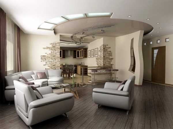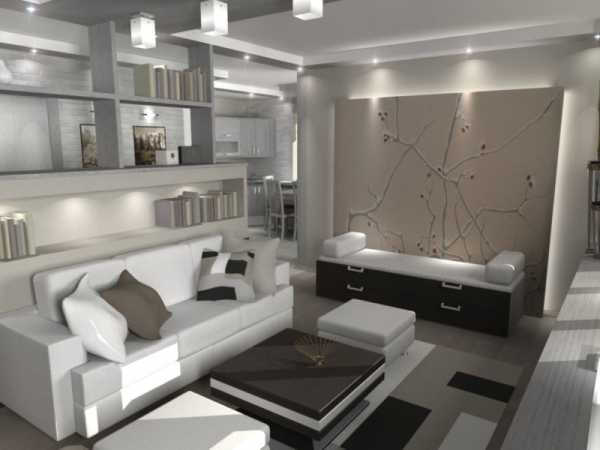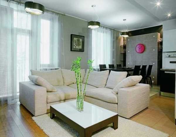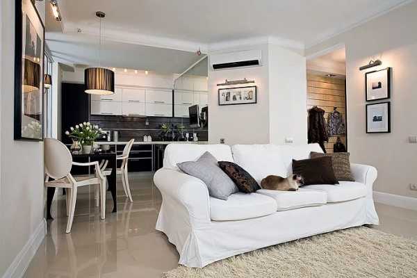 | Легкий, воздушный интерьер | Для визуального увеличения пространства можно использовать зеркальные поверхности, зонировать с помощью перегородок из легких, полупрозрачных тканей, тонкого, крепкого стекла. Если перегородки не нужны, зонирование можно сделать во время ремонта. Здесь важным моментом является грамотный подбор отделочного материала. Пол в разных зонах должен различаться: на кухне – плитка, гостиная в ламинате. В спальной зоне можно постелить пушистый ковер. Каждая зона должна иметь индивидуальное освещение. |