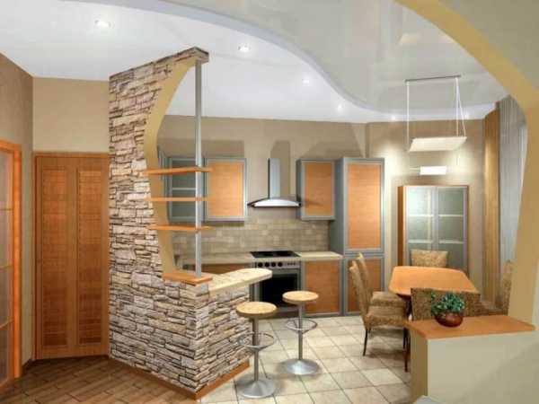 Функциональная барная стойка. Барная стойка может быть не только эстетически привлекательным разделительным элементом, но и обеденным столом или тумбой для хранения кухонных принадлежностей.
