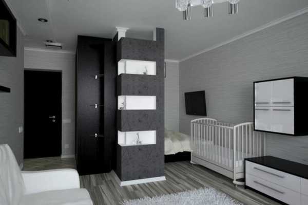 Если же яркие цвета не нравятся, можно сделать зонирование с помощью игры света или воздушных перегородок. Например, открытая полка от потолка до пола.