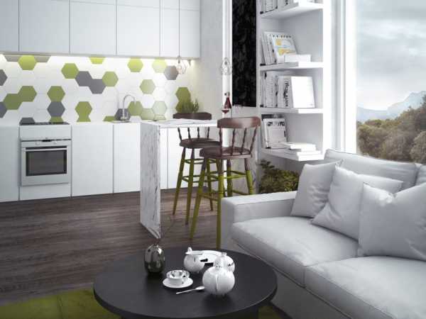 Если квартира находится в новом доме, то перепланировку можно сделать без особых проблем. Самый подходящий вариант – студия. Здесь разделяющим пространство элементом может быть барная стойка. Также исполняет роль обеденного стола. Или дополнительно установить на кухне стол-трансформер. Он может служить элементом для приема пищи или, в сложенном виде, журнальным столиком.