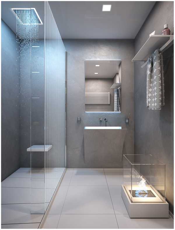 В ванной комнате основной свет дают галогеновые лампы, дополнительно можно подсветить туалетное зеркало.