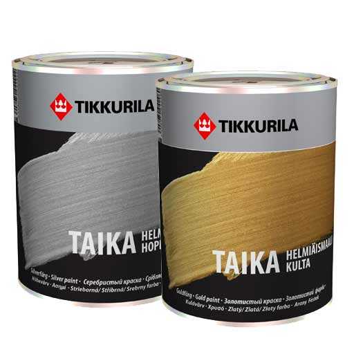- Краска на акрилатной основе Taika, предназначенная для ДВП, древесины и ДСП. Ее можно использовать как для первичной покраски дерева, так и для повторной. После окрашивания создается эффект перламутра и металлический блеск. Основный колера — золотой и серебряный. Состав колеруется в 10 оттенков. Краска Тиккурила Taika используется для обработки мебели, стен и интерьерных предметов. Расход составляет 1 л на 6-8 м2. Разбавителем служит вода.