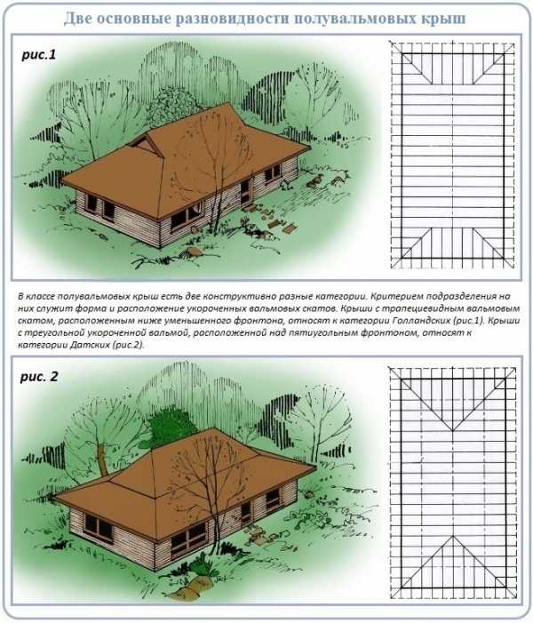 В зависимости от формы и расположения элементов полувальмовой двухскатной крыши выделяют два вида конструкций: