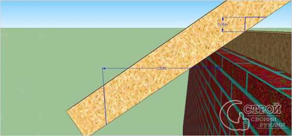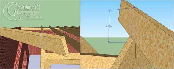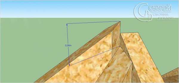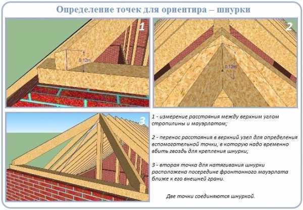 - Полученные путем измерений 26 см откладываются вверх от фронтонного мауэрлата в четырех точках, повторяющих воображаемый 3D контур стропильной доски.