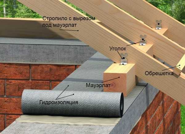 - На фронтальные и внешние стены настилается мауэрлат (на те, которые будут опорой для стропил). На внешнюю перегородку несущего типа монтируется лежень. Способ его крепления зависит от особенностей конструкции. В случае, если дом из кирпича, то проводится бетонирование стяжки, которая предварительно армируется и в нее устанавливаются шпильки. Если же сооружение деревянное, то для закрепления мауэрлата и лежаков применяют железные скобки ила болты. Гидроизоляцию в местах соединения стен и несущего бруса проводят с помощью рубероида. Для расчета необходимого расстояния между шпильками используется чертеж: нужно чтобы они были между расположенными стропильными ногами.