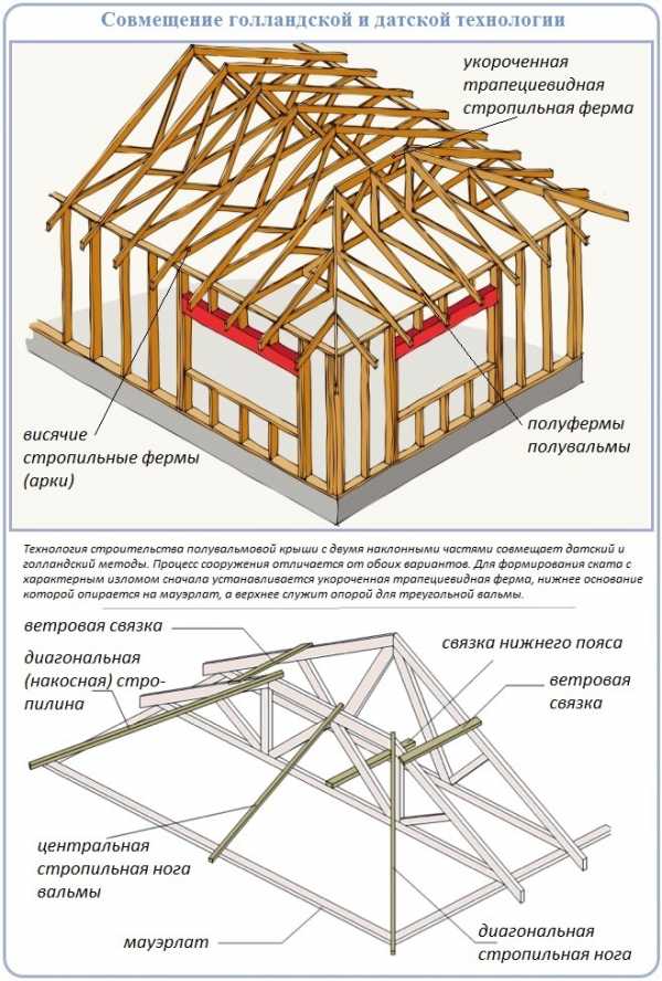 В целом стропильная система возводится на базе одного из способов устройства полувальмовой крыши или на их комплексном использовании. Если разобраться в тонкостях этих методов, можно своими руками сделать крышу по датской или голландской технологии, а также совместить укороченные вальмы с обычной скатной крышей.