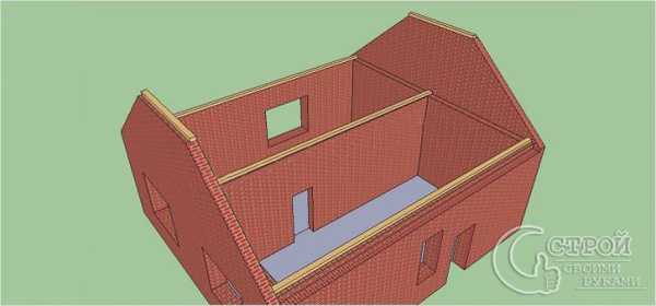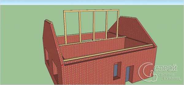 - Сооружение мауэрлата. В описываемом примере он не будет схож с традиционной деревянной рамой. Брус для устройства мауэрлата укладывается отдельными полосами: 1 – заподлицо с внутренней поверхностью наружных стен, 2- по центру внутренней несущей стены и 3 – заподлицо с внутренней плоскостью фронтонных стенок.