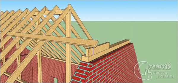 Чтобы обеспечить жесткость в зоне полувальмы, участки присоединения перемычки к рядовым стропилам усиливают подкосами. Крайние стропильные фермы с обеих сторон делают двойными. Места фиксации перемычки к стойке и к стропилинам дополнительно укрепляют коротышами – прибитыми снизу отрезками доски. Они предотвратят деформацию конструкции при превышении нагрузки.
