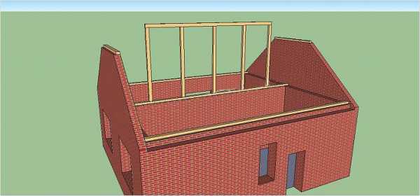 - На лежень внутренней несущей стены устанавливают вертикальные стойки, соединяют их сверху коньковым прогоном. Главный критерий качества монтажа – строгое соблюдение вертикальности. Угол между каждой стойкой и лежнем вымеряют по нескольку раз, для фиксации используют временные подпорки.