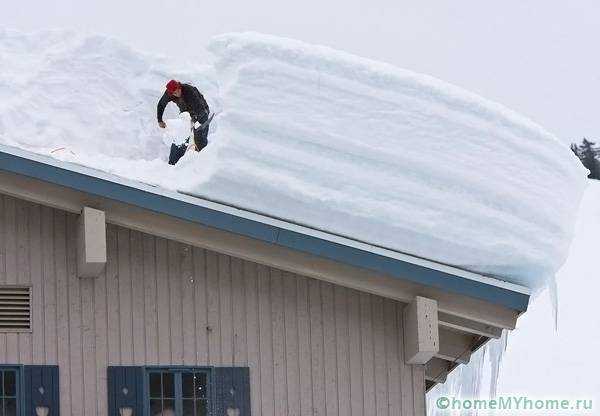 Благодаря разнице в высоте опорных стенок отвод осадков со ската происходит самопроизвольно. Это значит, что в организации внутреннего стока нет нужды. Чаще всего к низкой стороне односкатной крыши крепится водосточный желоб, превосходно справляющийся с задачами водоотведения в летний и демисезонный период. Зимой на пологих скатах может скапливаться снег. Залежи осадков удаляют по правилам очищения плоских крыш.