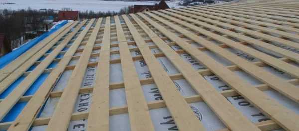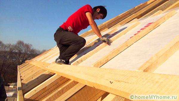 - На обрешетку настилается гидроизоляционный слой и фиксируется при помощи степлера. Укладка производится внахлест.