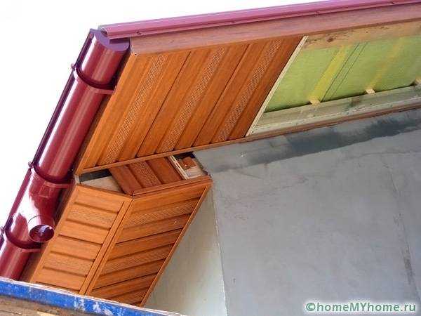 - Обшиваем потолок, не заполняя доской часть карнизного свеса для обеспечения вентиляции. Оставленное пространство закрываем сеткой, защищающей от проникновения насекомых.