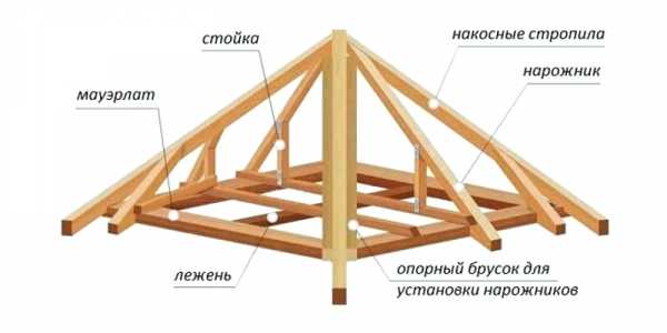 Основные элементы стропильной системы частного дома на примере четырехскатной крыши показаны на рисунке: