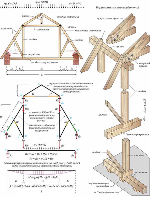 Стропильная система состоит из многих элементов. На каждый элемент действуют силы, разные по величине и направлению. На стропильную систему в целом и на отдельные её детали действуют нагрузки направленные вертикально, горизонтально и стремящиеся повернуть деталь.
