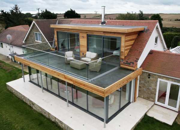 Стекло может быть как на всей поверхности крыши, так и покрывать одну его часть. Чаще всего такие стеклянные крыши устанавливаются не над всей поверхностью дома, а над террасой, балконом или небольшой верандой.