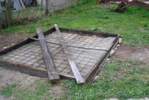 - Устанавливаем каркас из арматуры толщиной 8 миллиметров. После этого можно залить бетон марки М300. Размер площадки должен совпадать с площадью будущего курятника. Дальнейшие работы можно производить только через 3 недели.
