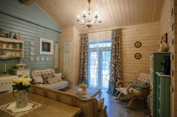 При оформлении потолка в стиле прованс используются светлые пастельные оттенки. Это может быть молочный, выбеленный оливковый, нежно-фисташковый, светло-голубой или белый. На фоне таких, будто выгоревших на солнце, оттенков замечательно будут смотреться массивные деревянные балки. Иногда и их выкрашивают в тон потолка, чтобы сделать светлее плохо освещенное помещение.