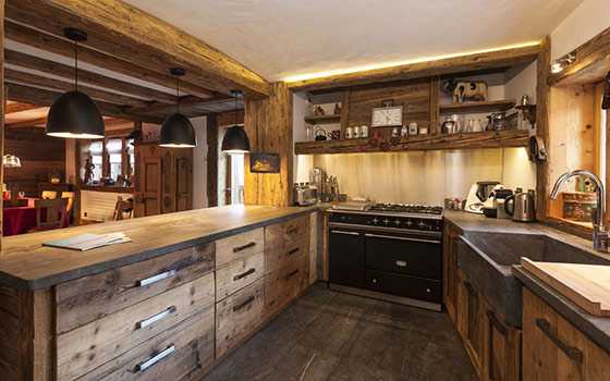 Также вместе с гостиной находится кухня и в деревянных домиках стиля шале. Мебель в таком камбузе обязательно вся деревянная и массивная, топорной работы. Глянец отсутствует вовсе. По возможности матируют даже духовой шкаф и мойку.