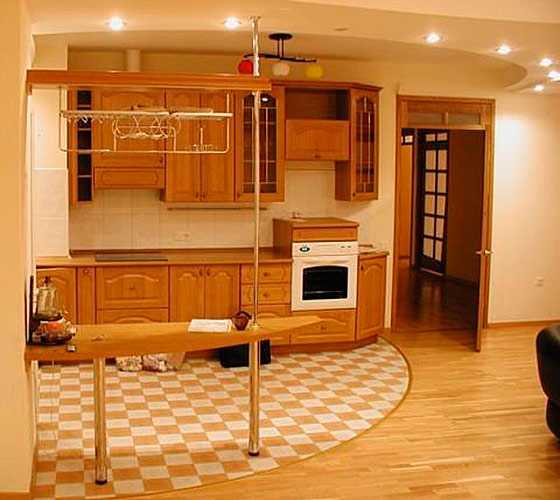 Аналогичную функцию выполняет и островок. Разница только в том, что для него необходимо гораздо больше места. А так, та же функциональность, та же красота, да и с зонирующими обязанностями справляется прекрасно.