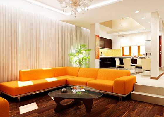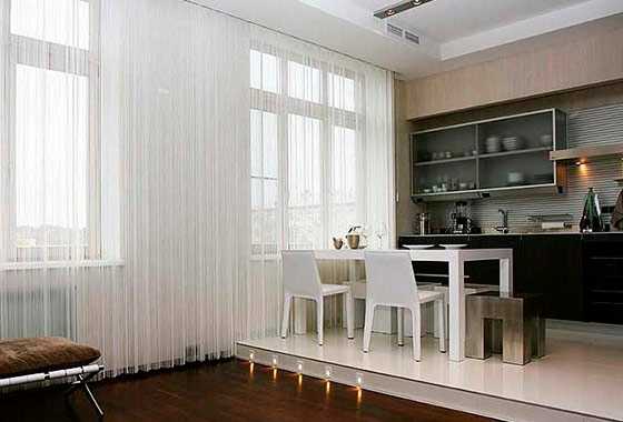 - Серьезно отнеситесь к выбору штор. Занавески из воздушной ткани зрительно расширят небольшую комнату. Если проблем с площадью помещения нет, обратите внимание на плотные шторы, которые предотвратят проникновение солнечных лучей в жаркий день. Если гостиная и кухня совмещены, занавески должны быть одинаковыми или сочетаться между собой.