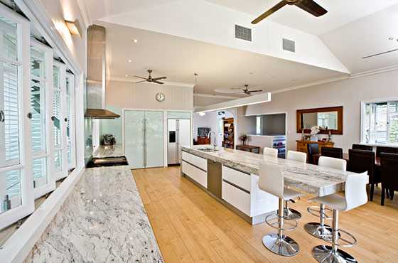 Разместив кухню на веранде дома, можно избежать появления неприятных запахов в доме и удачно использовать свободное пространство веранды. Такое расположение обеденной зоны позволит всей семье собираться на свежем воздухе. Недостатком установки кухни на веранде можно обозначить сложности в проведении коммуникаций и зависимость от погодных условий: ветра и дождя.