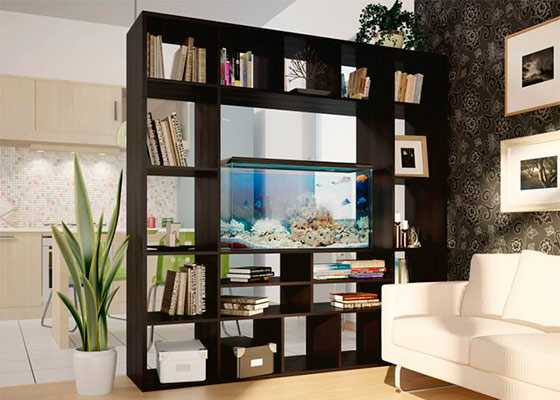 Коль уже коснулись мебели, то почему бы не вспомнить и о стеллаже. С одной стороны, вещь на кухне незаменимая, а с другой – он с лёгкостью выполнит роль перегородки.