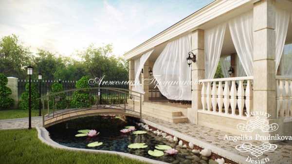 На фото: Пруд с беседкой на участке загородного домаБлагодаря небольшому искусственному пруду, украшенному цветками лотоса, бежевая беседка в средиземноморском стиле превращается в настоящую крепость, в которую можно попасть лишь миновав мостик. Дно водоема ландшафтные дизайнеры выложили белыми камнями. Уличные фонари в этой области в вечернее время создадут на воде романтичные блики. В жаркую погоду пруд позволит сохранять в беседке приемлемый уровень влажности.