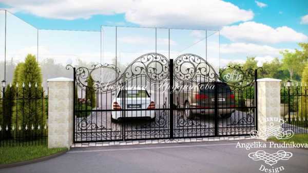 На фото: Входные ворота с художественной ковкой в ландшафтном дизайнеГлавные ворота можно рассматривать как часть ландшафтного дизайна загородного дома. Входная конструкция должна сочетаться не только с декором забора, но и органично вписываться в природный ландшафт, дополняя его. Ворота с художественной ковкой на фото — весьма универсальное решение, которое можно заказать как для современного ландшафтного дизайна, так и для участков, тяготеющих к какому-либо из исторических стилей. Кованая конструкция, будучи достаточно тяжелой, не выглядит массивной. Она также позволяет рассмотреть архитектуру фасада здания со стороны улицы.