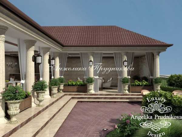 На фото: Веранда с колоннами и уличными фонарямиВеранда в итальянском стиле снаружи украшена классическими колоннами, старинными фонарями и вазонами с цветами. Декор, заимствованный у античности, добавляет архитектуре здания нотки классицизма.