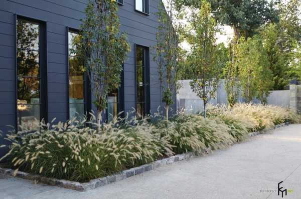На фото: Ландшафтный дизайн участка с групповым принципом посадки деревьев и кустарниковКак мы уже упоминали выше, в современном ландшафтом дизайне приветствуется групповой принцип рассадки деревьев и кустарников. Считается, что одинаковые или схожие растения должны располагаться близко друг другу. Такой прием позволяет им выглядеть более внушительно. В представленном на фото ландшафтом дизайне загородного дома растения рассажены островками. Высокие хвойные деревья могут быть посажены поодиночке. И не забывайте позаботиться о создании ограждений для участков газонов и отдельных групп растений.